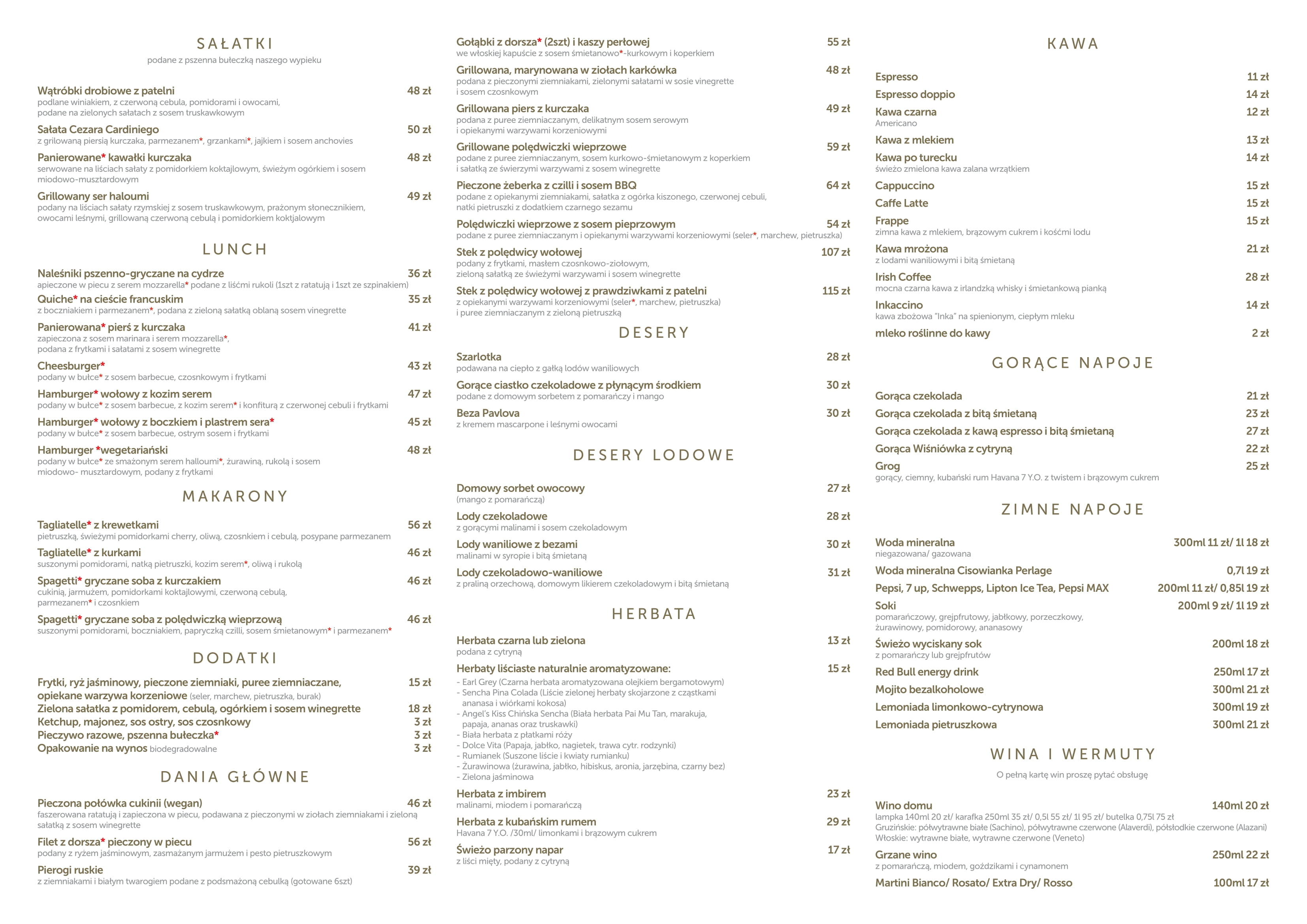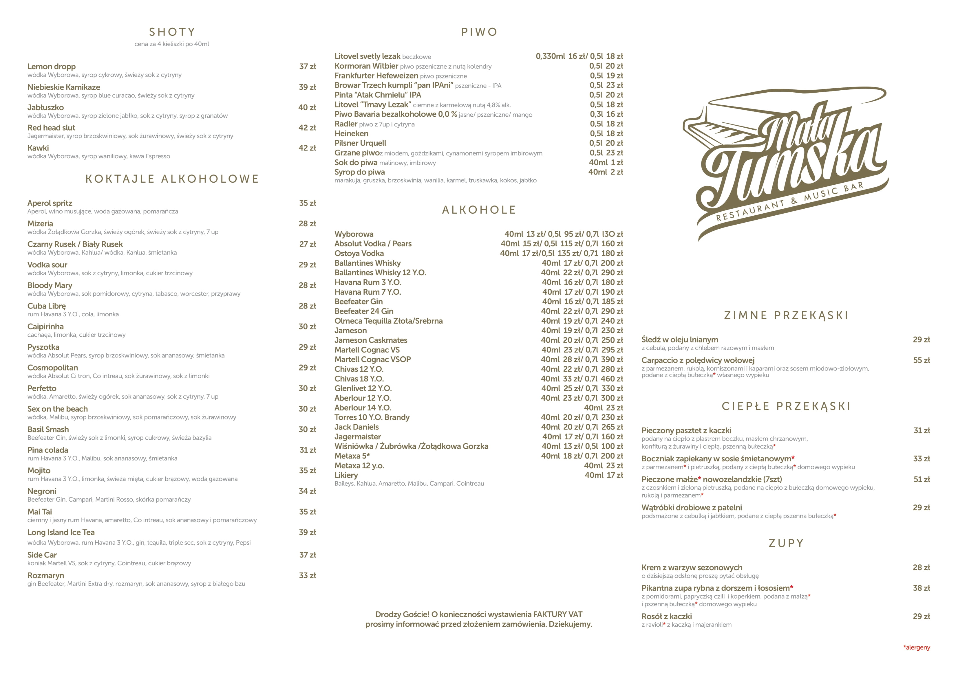 Menu jest bardzo różnorodne. Do wyboru: zupy, przystawki, sałatki, dania lunchowe, makarony oraz dania z ryb i mięs. Na przystawkę polecamy prawdziwy paprykarz szczeciński, a na obiad gołąbki z dorsza na stosie śmietanowym z koperkiem. Wszystko w jasnej, przytulnej przestrzeni i ciepłej atmosferze. W logo Małej Tumskiej widnieje fortepian i podpis "restaurant and music bar", gdyż w lokalu w każdy sobotni wieczór rozbrzmiewają instrumenty i muzyka na żywo